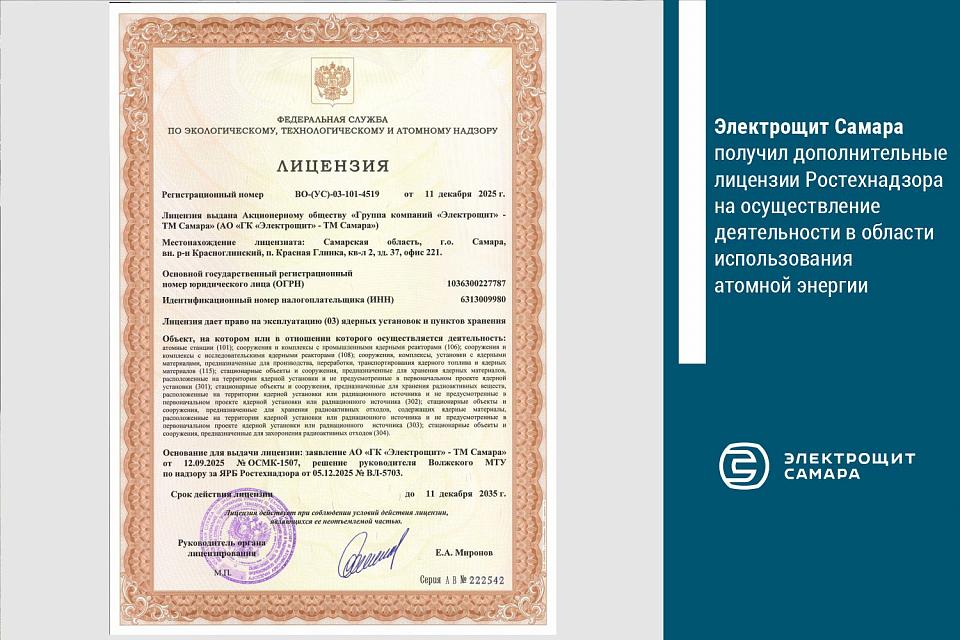Федеральная служба по экологическому, технологическому и атомному надзору (Ростехнадзор) выдала компании Электрощит Самара дополнительные лицензии на осуществление деятельности в области использования атомной энергии.
